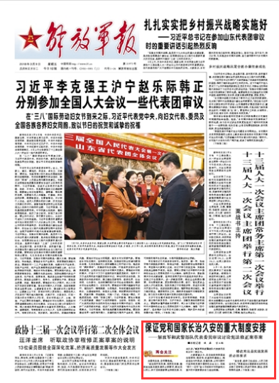 大家普遍認為,在總體保持我國憲法連續(xù)性、穩(wěn)定性、權威性的基礎上,推動憲法與時俱進、完善發(fā)展,必將為新時代堅持和發(fā)展中國特色社會主義、實現(xiàn)“兩個一百年”奮斗目標和中華民族偉大復興的中國夢提供有力憲法保障。請關注今日《解放軍報》的報道——