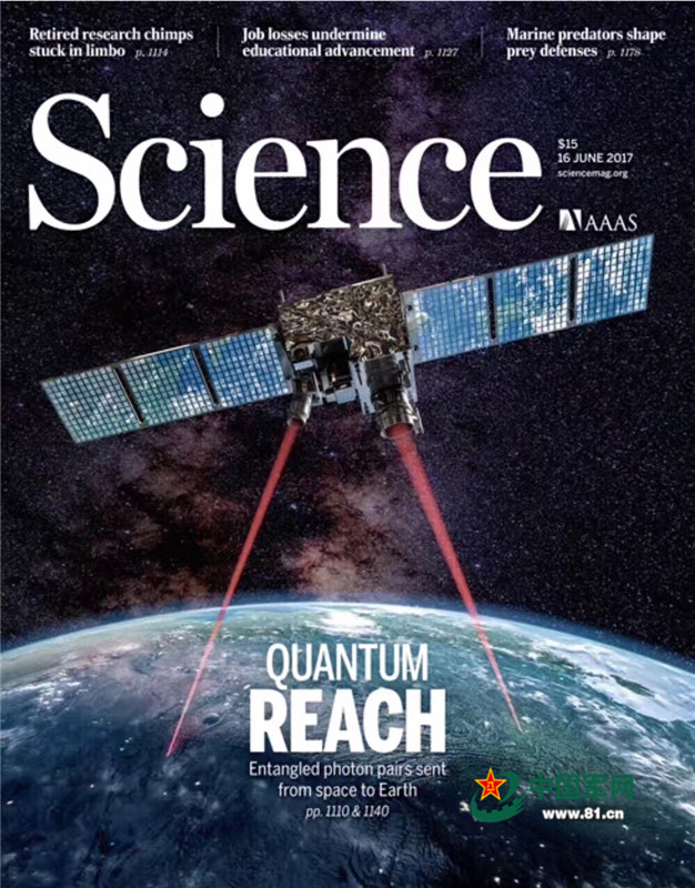 美國《科學(xué)》雜志封面上,“墨子號”從星空向地面發(fā)出兩道光,象征量子通信向?qū)嵱眠~近一大步。
