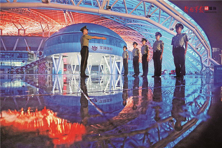 夜幕下在第十三屆全運(yùn)會(huì)開幕場(chǎng)館巡邏的戰(zhàn)士。劉春輝 攝