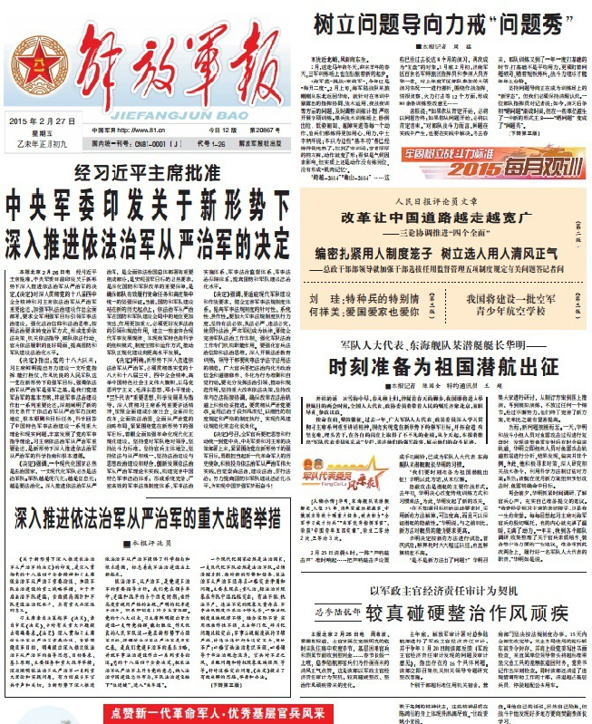 法治不彰,軍紀(jì)不明。2015年2月,中央軍委印發(fā)《關(guān)于新形勢下深入推進(jìn)依法治軍從嚴(yán)治軍的決定》,依法治軍從嚴(yán)治軍駛?cè)肟燔嚨溃叭齻€根本性轉(zhuǎn)變”深入推進(jìn)。