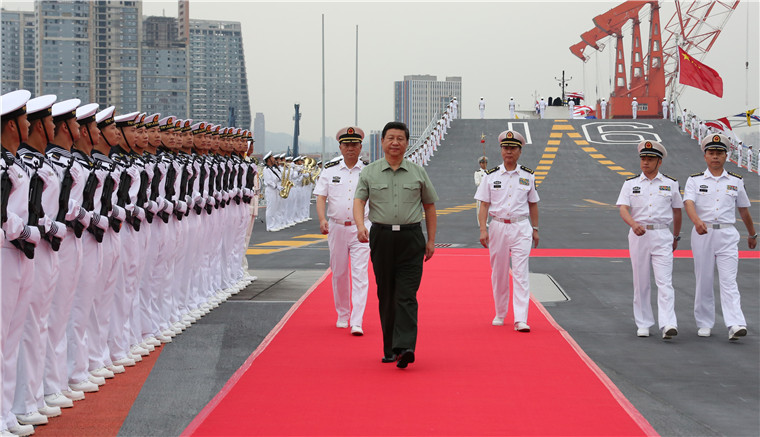 2013年8月28日,習(xí)主席冒著風(fēng)雨登上遼寧艦,檢閱水兵儀仗隊,攀舷梯、下機庫,深入艙室戰(zhàn)位,察看裝備設(shè)施,詳細詢問技戰(zhàn)術(shù)性能,與官兵親切握手,了解工作訓(xùn)練情況,親自上前操作設(shè)備,體驗著艦指揮員的工作。
