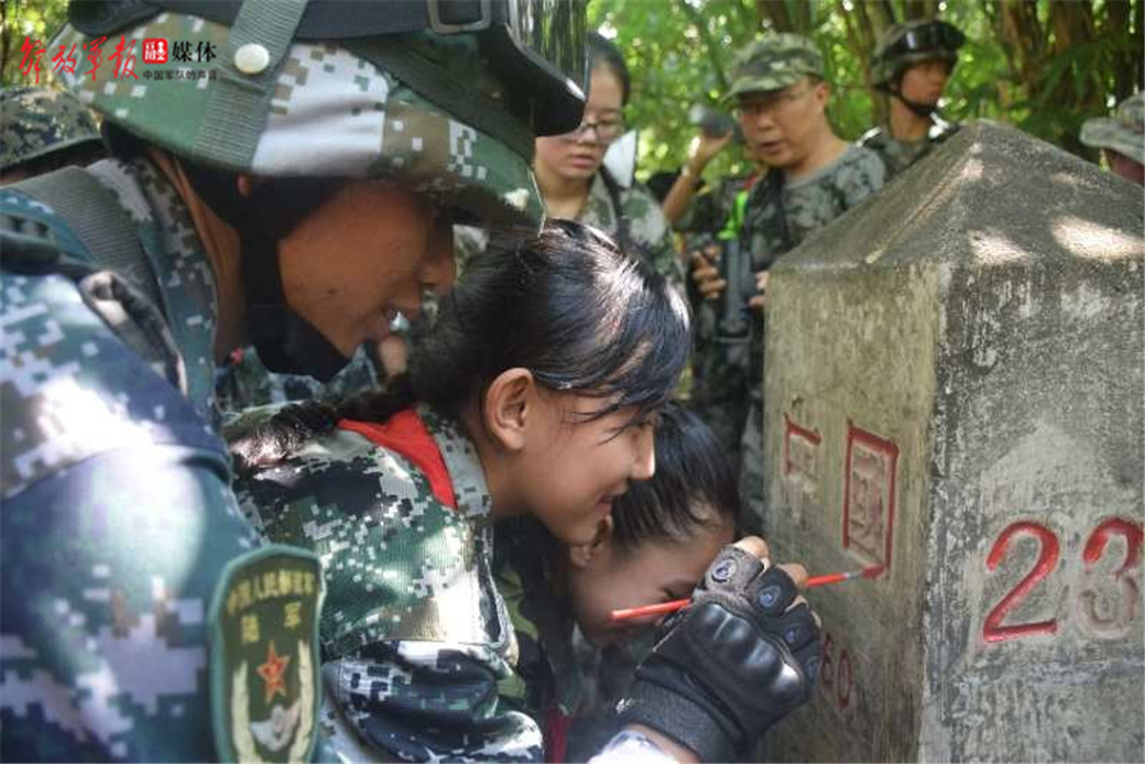 聯(lián)合駐地學(xué)生開展走邊關(guān)活動,圖為向界碑描紅。