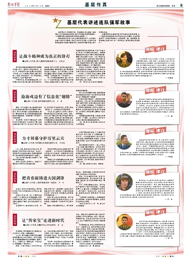 時間轉(zhuǎn)眼過去,我也從青澀的排長成長為一名基層主官,每當(dāng)回想起這段刻骨銘心的經(jīng)歷,我的心里總是不能平靜:在感恩黨史軍史和光榮傳統(tǒng)教育激勵我成長的同時,我更加關(guān)注如何傳承紅色基因,讓“傳家寶”走進新時代。如今我正和中隊官兵一起探索搭建一個時尚的紅色文化傳播體系,增強紅色傳統(tǒng)的內(nèi)在吸引力,相信我們一定可以成功!