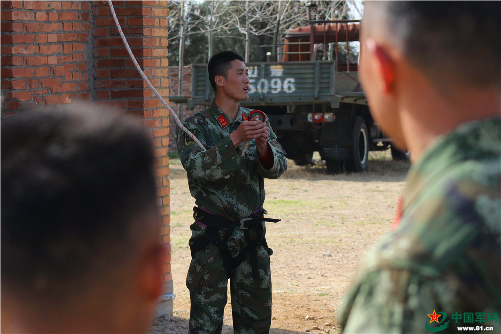 作為曾經(jīng)的偵察隊員,班長李俊正在向戰(zhàn)士講解攀登的動作要領(lǐng)。