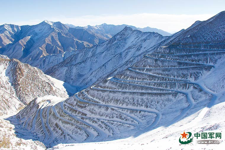 新疆軍區(qū)別迭里邊防連通往烏宗圖什河哨所的路必須繞行36個“之”字回頭彎才能翻越達(dá)坂。向曉東攝
