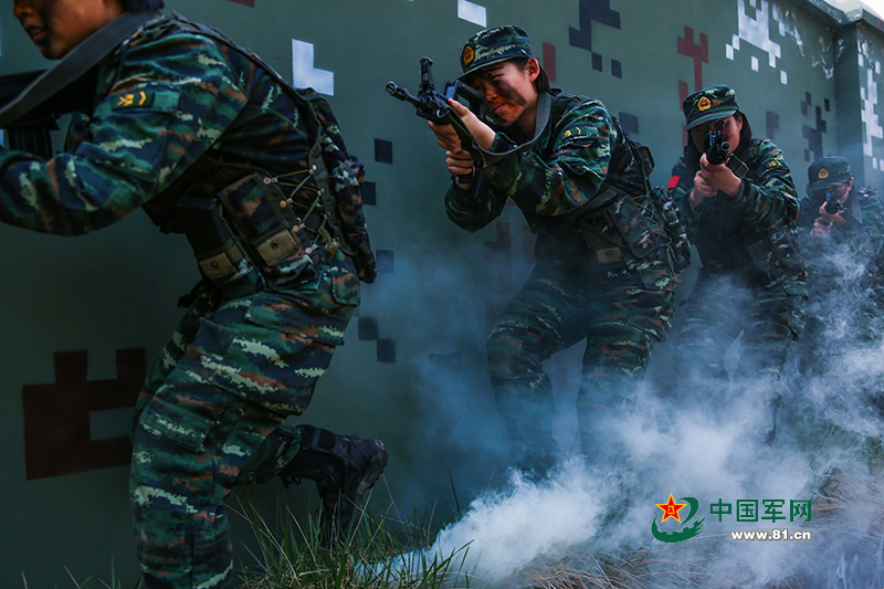 “據(jù)情報確認,前方發(fā)現(xiàn)兩名‘暴恐分子’,上級命令我小組迅速展開行動,對‘暴恐分子’實施抓捕?!?隨著一聲“集合”命令傳來,幾名戰(zhàn)斗小組組長迅速集合研究行動方案?!靶袆印保犹厍诎喟嚅L肖茗丹剛剛下達命令,各個小組迅速展開行動,占領有利位置,對‘暴恐分子’實施圍剿。行動過程中,硝煙彌漫,伴隨著陣陣爆炸聲,特戰(zhàn)女兵們協(xié)同配合,成功將‘暴恐分子’制服。