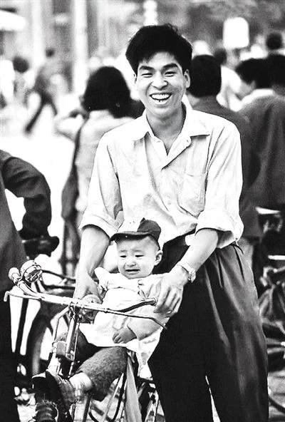 圖為上世紀80年代,騎著自行車帶著孩子的爸爸露出幸福的笑容。