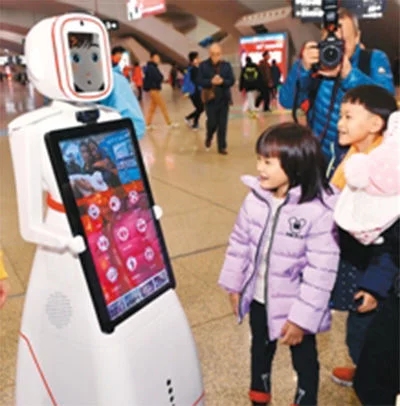 2017年1月13日,在廣州南站,小朋友與為旅客提供咨詢服務的智能機器人“小璐”互動。