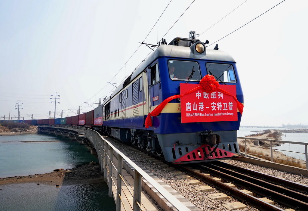 發(fā)往比利時安特衛(wèi)普的國際集裝箱班列從河北唐山港京唐港區(qū)駛出(4月26日攝)。