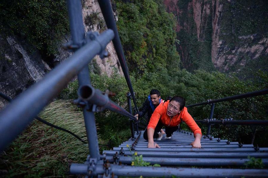 2017年10月13日,四川省涼山彝族自治州昭覺(jué)縣支爾莫鄉(xiāng)阿土勒爾村,村民正在攀爬“懸崖村”鋼梯。