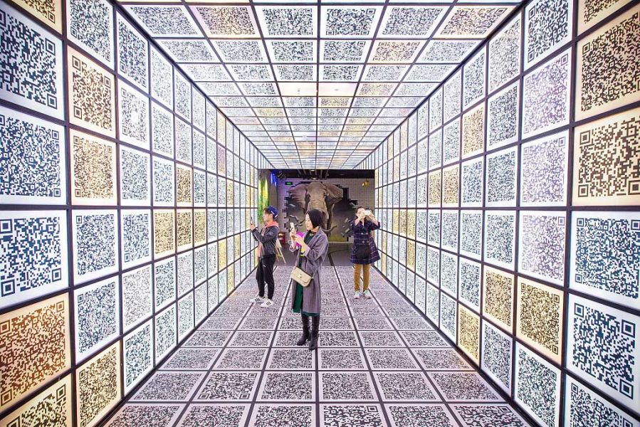 2017年4月6日,江蘇省南京市,顧客被二維碼隧道所吸引。
