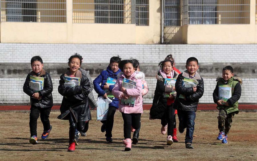 2018年2月26日,在江西省撫州市東鄉(xiāng)區(qū)小璜鎮(zhèn)小學,孩子們拿著剛領取的新學期免費課本,開心地在校園里奔跑。