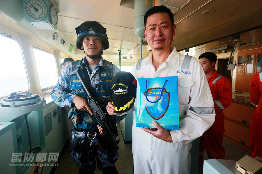 海軍特戰(zhàn)隊(duì)員向“振華25”號商船船長贈送徐州艦艦帽。張千 攝
