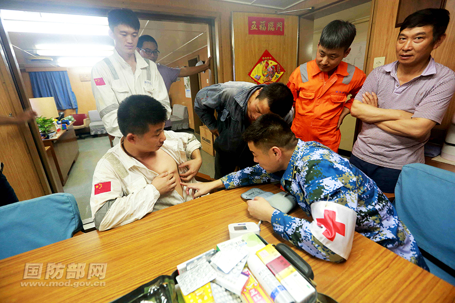 徐州艦軍醫(yī)為“振華25”號(hào)商船船員檢查身體。張千 攝