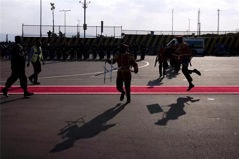 △機(jī)場歡送儀式開始前,軍樂團(tuán)成員跳過紅地毯。在盧旺達(dá),除了元首以外,其他人不可以踩上儀式專用紅地毯。(央視記者王哈男拍攝)