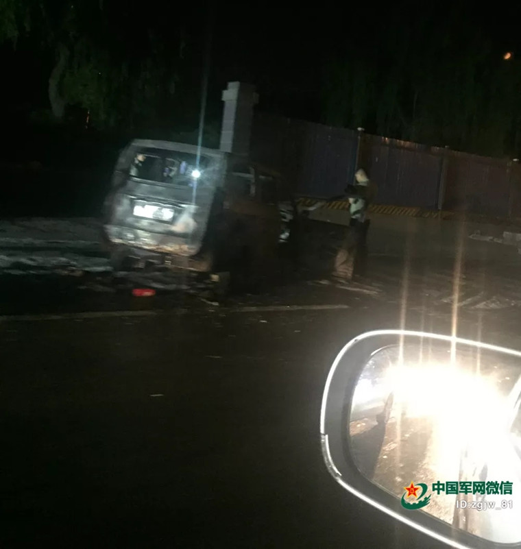 杜帥歸隊途中拍攝的已被消防人員撲滅大火后的面包車。