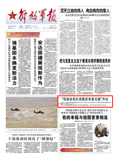 為配合做好預備役部隊調整改革研究論證工作,征集廣大官兵的意見建議,近日依托強軍網開設“預備役部隊調整改革意見箱”(強軍網www.qjw.jw/)。請關注今日《解放軍報》的報道——