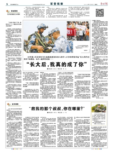 考慮到余震的危險(xiǎn),官兵們多次勸程強(qiáng)離開,父親也不許他外出,都擋不住他追隨空降兵官兵的步伐。