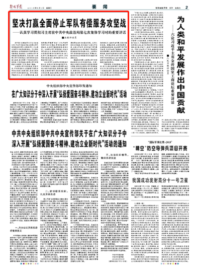 全面停止軍隊(duì)有償服務(wù),對(duì)純正部隊(duì)政治生態(tài)、保持我軍性質(zhì)和本色,對(duì)實(shí)現(xiàn)黨在新時(shí)代的強(qiáng)軍目標(biāo)、把人民軍隊(duì)全面建成世界一流軍隊(duì),對(duì)鞏固黨的執(zhí)政地位、確保國(guó)家長(zhǎng)治久安,都具有重大意義。請(qǐng)關(guān)注今日《解放軍報(bào)》的報(bào)道——