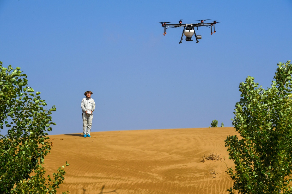 在內(nèi)蒙古鄂爾多斯市杭錦旗的庫布其沙漠中,技術(shù)人員操控無人機飛播造林(7月11日攝)。新華社記者 彭源 攝