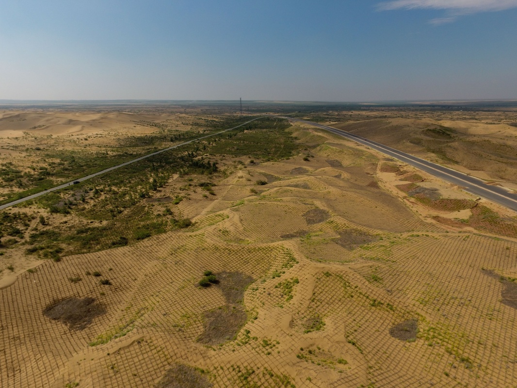 庫布其沙漠中的人工沙障(8月2日無人機拍攝)。新華社記者 劉磊 攝