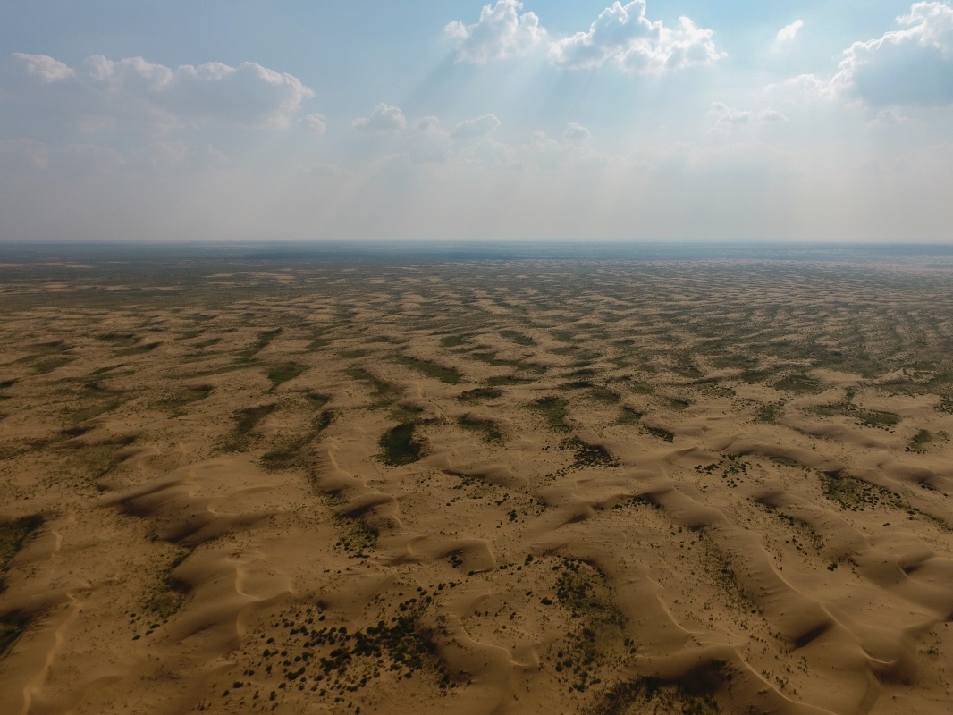 庫(kù)布其沙漠深處,植被與沙漠形成美麗的紋理(7月31日無(wú)人機(jī)拍攝)。新華社記者 劉磊 攝