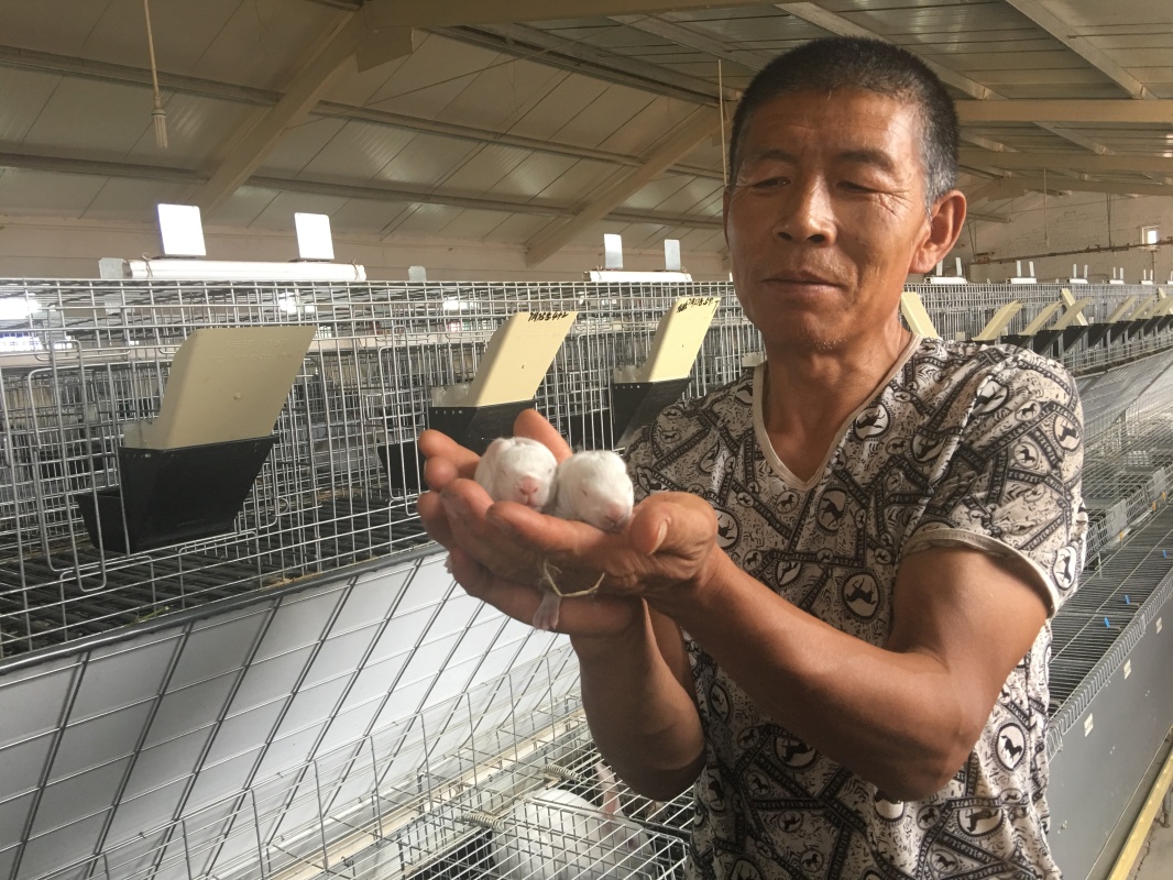 在庫(kù)布其沙漠中的內(nèi)蒙古鄂爾多斯市達(dá)拉特旗風(fēng)水梁園區(qū)獺兔標(biāo)準(zhǔn)化養(yǎng)殖示范中心,工作人員展示剛出生不久的獺兔幼崽(8月1日攝)。風(fēng)水梁原名“風(fēng)干圪梁”,曾經(jīng)風(fēng)沙肆虐,人煙稀少。如今,在政府主導(dǎo)下,內(nèi)蒙古東達(dá)蒙古王集團(tuán)將林、草、沙三業(yè)結(jié)合,打造農(nóng)工貿(mào)一體化產(chǎn)業(yè)鏈,實(shí)現(xiàn)了沙漠增綠、農(nóng)牧民增收、企業(yè)增效的良性循環(huán)。新華社記者 張善臣 攝