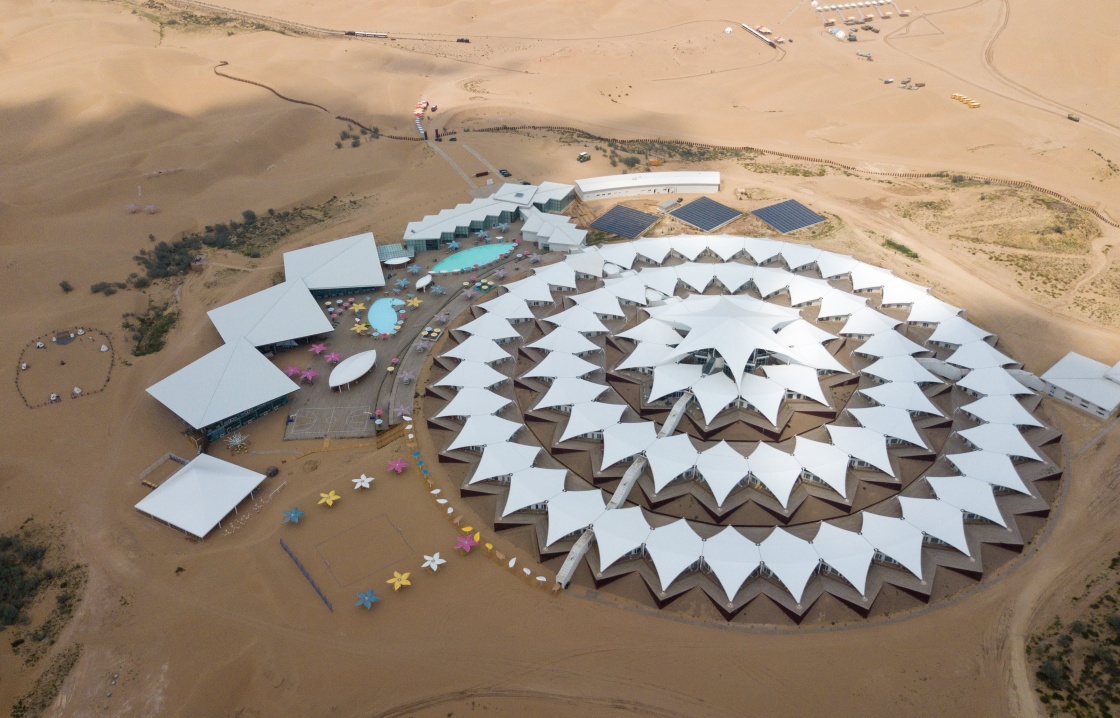 庫布其沙漠中的響沙灣蓮花度假酒店(7月31日無人機拍攝)。新華社記者 彭源 攝