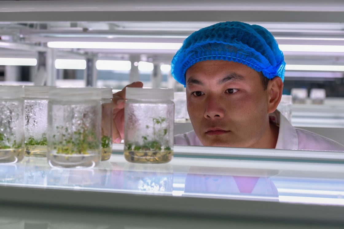 在億利集團(tuán)庫(kù)布其生態(tài)科技中心的沙生植物育苗實(shí)驗(yàn)室內(nèi),科研人員在觀察沙生植物的生長(zhǎng)狀況(7月11日攝)。新華社記者 彭源 攝