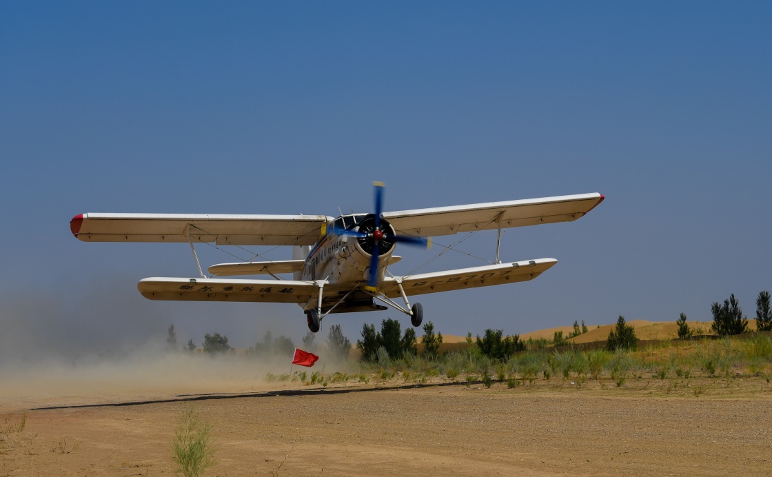 在內(nèi)蒙古鄂爾多斯市的庫布其沙漠腹地,一架飛播造林用的飛機(jī)起飛(7月11日攝)。新華社記者 彭源 攝