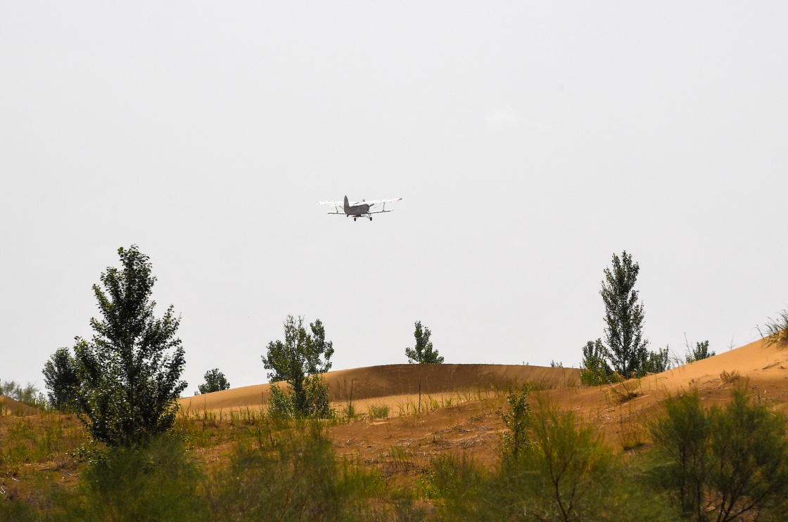 在內(nèi)蒙古鄂爾多斯市的庫布其沙漠腹地,一架飛播造林用的飛機(jī)飛向沙海(7月11日攝)。新華社記者 彭源 攝