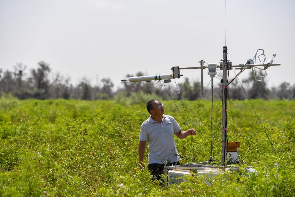 在內(nèi)蒙古鄂爾多斯市的庫布其沙漠中的億利集團阿木古龍甘草健康產(chǎn)業(yè)園,工作人員在儀器前觀測氣候土壤條件(7月11日攝)。新華社記者 彭源 攝