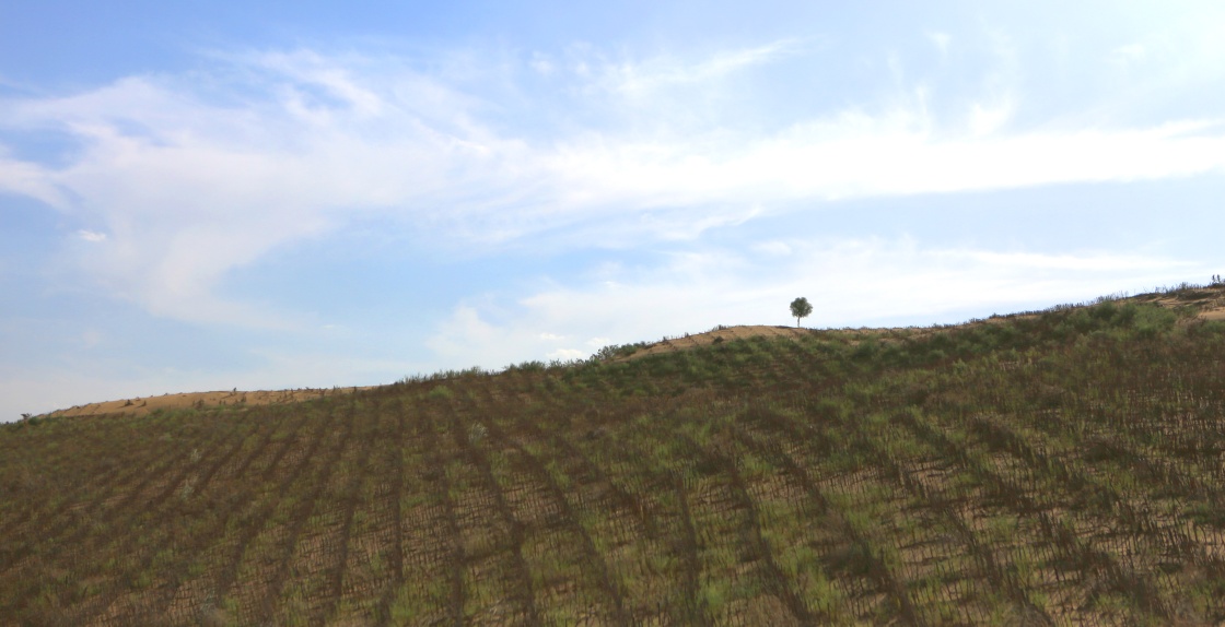 在內(nèi)蒙古鄂爾多斯市杭錦旗,新修的穿沙公路旁打上了沙障(7月26日攝)。新華社記者 盧燁 攝