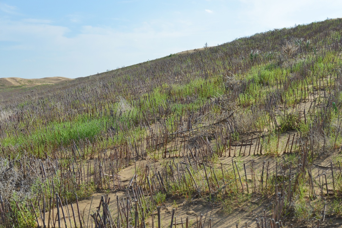 在內(nèi)蒙古鄂爾多斯市杭錦旗,新修的穿沙公路旁打上了沙障(7月26日攝)。新華社記者 鄒予 攝