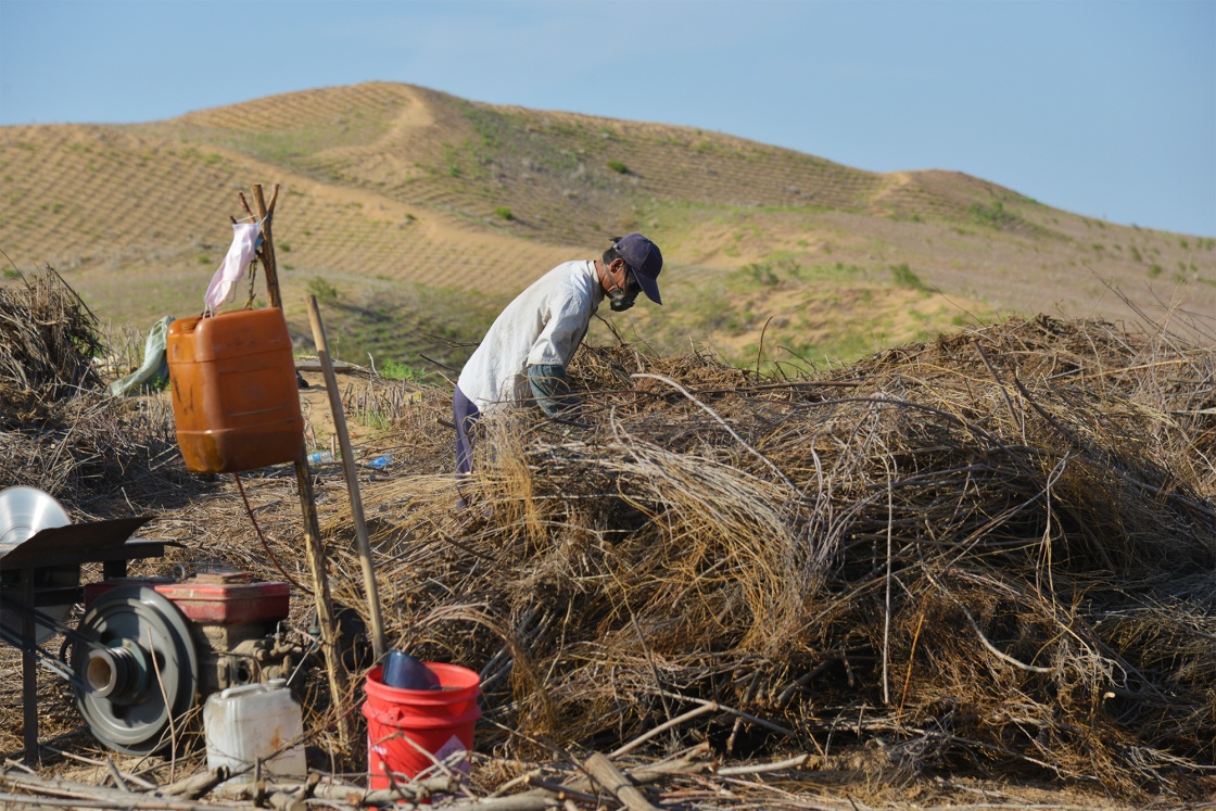 在內(nèi)蒙古鄂爾多斯市杭錦旗,工人為新修的穿沙公路制作沙障(7月26日攝)。新華社記者 鄒予 攝