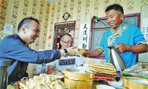 杭錦旗獨貴塔拉鎮(zhèn)道圖嘎查牧民斯仁巴布(右一)依托庫布其沙漠、七星湖等旅游資源,開辦的“牧農(nóng)樂”紅紅火火。