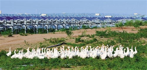 億利集團庫布其生態(tài)光伏基地通過“板上發(fā)電、板下種植、板間養(yǎng)殖”的模式,實現(xiàn)銷售收入4.5億元,帶動當(dāng)?shù)厝罕娒撠氈赂弧?/font>