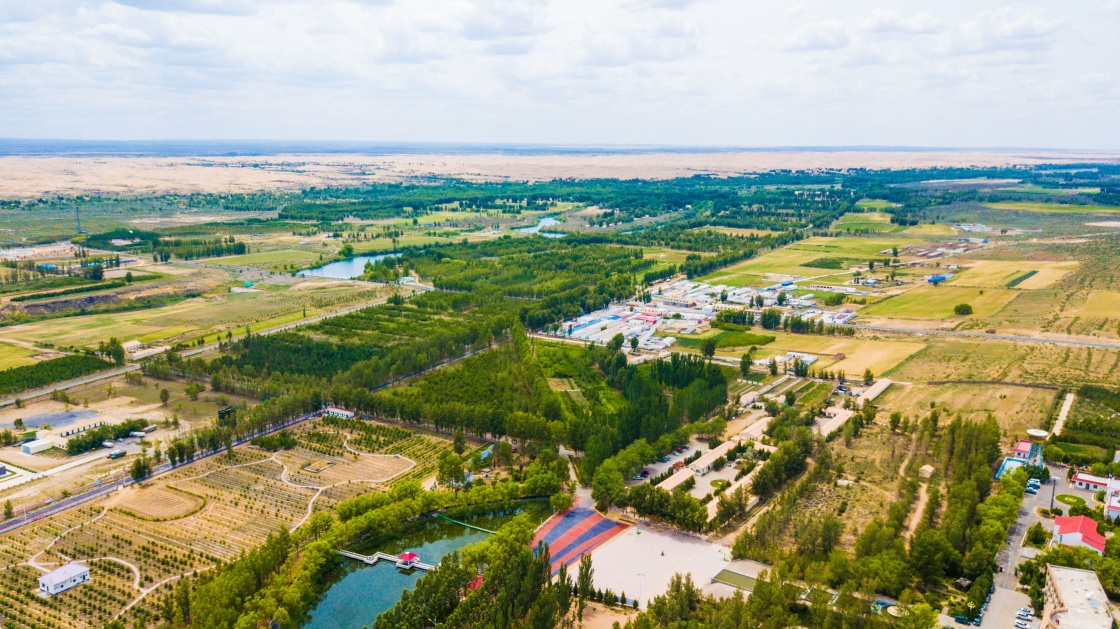地處庫(kù)布其沙漠的恩格貝景區(qū)(6月8日無(wú)人機(jī)拍攝)。新華社記者 彭源 攝