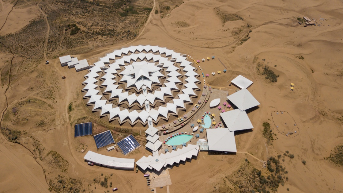 這是響沙灣景區(qū)內(nèi)的蓮花酒店(7月14日無人機拍攝)。新華社記者 彭源 攝