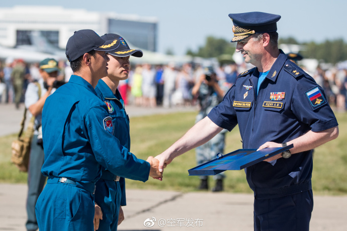 當(dāng)?shù)貢r(shí)間上午10時(shí),來自中國、俄羅斯、白俄羅斯和哈薩克斯坦的空軍參賽飛行員、裁判員和部分保障人員在俄羅斯梁贊州嘉吉列沃機(jī)場整齊列隊(duì),參加“航空飛鏢”項(xiàng)目的閉幕式。俄羅斯空天軍副司令兼空軍司令尤金中將、中國空軍參謀長助理王剛少將以及其他參賽國指揮官出席閉幕式,祝賀“航空飛鏢”項(xiàng)目比賽圓滿落幕。