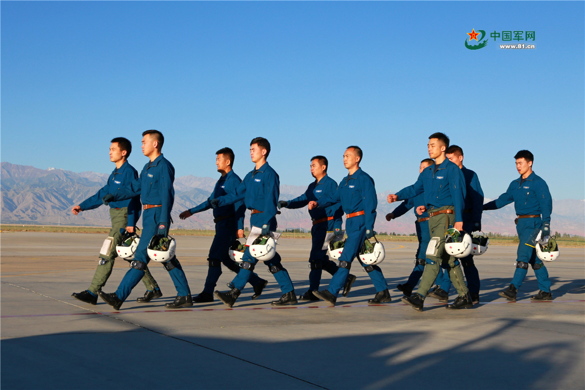 開飛前指示下達(dá)后,飛行員列隊進(jìn)場。