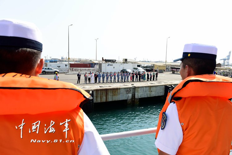 我駐吉布提共和國大使館、駐吉布提保障基地和中遠(yuǎn)西亞公司等人員在碼頭迎接。 來永雷 攝