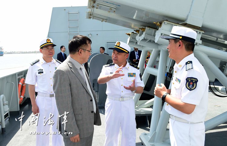 卓瑞生大使參觀蕪湖艦的主要裝備。來永雷 攝