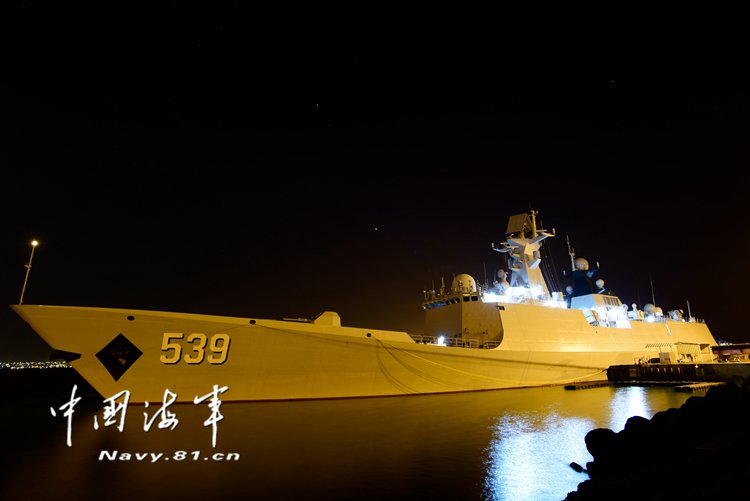 夜幕下停泊在吉布提港內(nèi)的蕪湖艦。來(lái)永雷 攝
