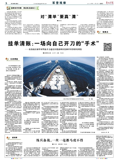 列出問(wèn)題清單,歸根結(jié)底是為了開(kāi)展“清零行動(dòng)”,必須持續(xù)解決問(wèn)題。今天出版的《解放軍報(bào)》為您帶來(lái)東部戰(zhàn)區(qū)海軍對(duì)照戰(zhàn)斗力建設(shè)問(wèn)題清單糾治和平積弊的新聞?wù){(diào)查——