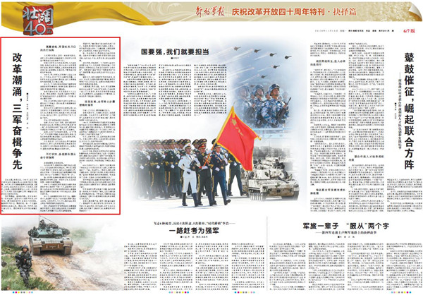 1978年,決定當(dāng)代中國(guó)命運(yùn)的關(guān)鍵抉擇——改革開放拉開帷幕。沒(méi)有改革中的一次次抉擇,就沒(méi)有今天強(qiáng)軍興軍的大好局面。人民軍隊(duì)發(fā)展史,就是一部改革創(chuàng)新史。我軍之所以始終充滿蓬勃朝氣,同我軍與時(shí)俱進(jìn)不斷推進(jìn)自身改革密不可分。請(qǐng)關(guān)注今天出版的《解放軍報(bào)》“慶祝改革開放四十周年特刊·抉擇篇”帶來(lái)的詳細(xì)報(bào)道——
