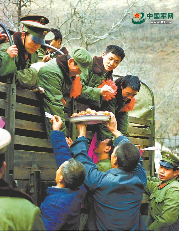 百萬大裁軍開始后,大量干部、戰(zhàn)士復轉退役。圖為某部戰(zhàn)士復員前與戰(zhàn)友和駐地群眾依依惜別。呂國興攝