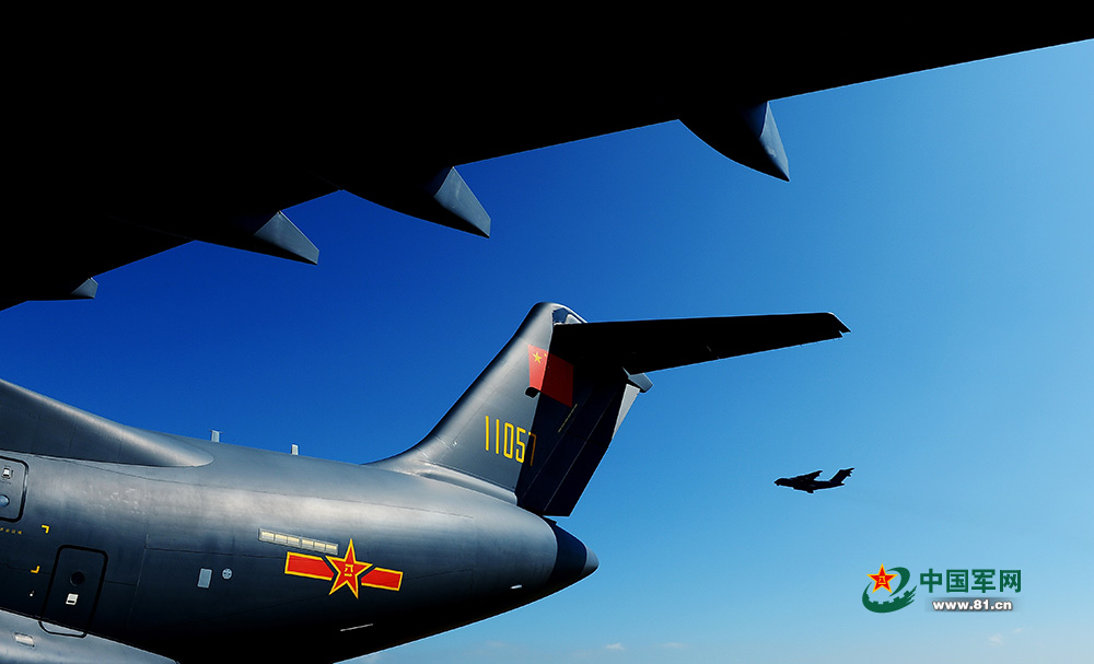 11月6日,地面靜態(tài)展示與空中飛行表演的運(yùn)-20大型運(yùn)輸機(jī)交相輝映。