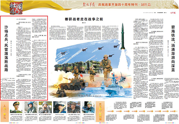 “戰(zhàn)爭(zhēng)就在明天,我們必須快馬加鞭?!闭驹谥烊蘸透叩靥魍簭膰?yán)冬到酷暑,從寒區(qū)到溫區(qū),從高原到海島,從大漠到大洋……縱觀近幾年來(lái)我軍的重大演習(xí)演練,不僅覆蓋了全季節(jié)、全天候、全地域,更凸顯全系統(tǒng)全要素參與、戰(zhàn)略戰(zhàn)役力量全覆蓋、陸??仗祀娙S展開(kāi)等鮮明的時(shí)代特點(diǎn)。請(qǐng)關(guān)注今天出版的《解放軍報(bào)》“慶祝改革開(kāi)放四十周年特刊·制勝篇”發(fā)表的文章——