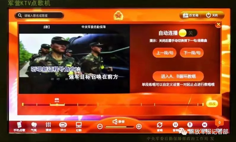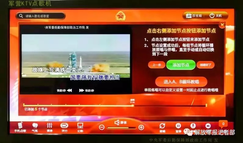 活躍基層連隊(duì)文化,器材和人才最重要。為解決長(zhǎng)期困擾基層一線連隊(duì)和偏遠(yuǎn)高山、海島倉(cāng)庫(kù)、哨所缺少教歌員的現(xiàn)狀,軍委后勤保障部政治工作局組織有關(guān)專家和技術(shù)人員攻關(guān),研發(fā)了全新的基層連隊(duì)教歌系統(tǒng),該系統(tǒng)安裝在“軍營(yíng)KTV點(diǎn)歌機(jī)”后,較好地解決了連隊(duì)教歌人才匱乏的問(wèn)題,現(xiàn)被廣泛應(yīng)用于各軍兵種的基層一線部隊(duì),受到了廣大基層官兵的好評(píng)。